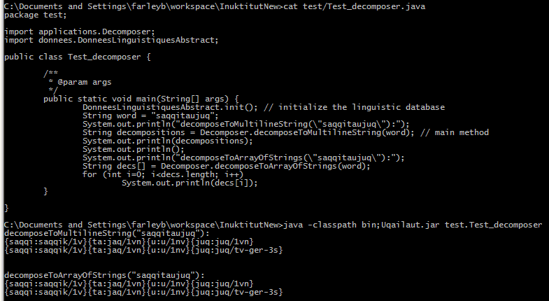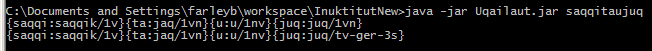Une version programmatique de l'analyseur morphologique de l'inuktitut UQA·ILA·UT est maintenant disponible pour fins de recherche. Contenu dans un fichier .jar Java, l'analyseur peut être exécuté localement sur votre ordinateur personnel, soit directement à partir de la ligne de commande (figure 1), soit par appel d'une méthode dans un programme Java (figure 2). Le mot inuktitut donné en argument sur la ligne de commande ou à la méthode est analysé et une chaîne de caractères est retournée contenant la ou les décompositions trouvées par l'analyseur. Une décomposition est une expression représentant la séquence des morphèmes qui composent le mot ; pour chaque morphème, on présente sa forme de surface dans le mot, suivi de sa référence dans la base de données linguistiques. Le fichier .jar contient aussi des méthodes pour retourner le sens d'une décomposition, c'est-à-dire le sens de chaque morphème (figure 3). Enfin, le fichier .jar contient un ensemble de documents texte dans lesquels se trouvent des tables donnant le sens associé à chaque référence de morphème utilisée dans les décompositions, tels que présentés à la figure 3.