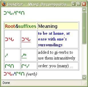 Inuktitut Word Definition is an application of the Inuktitut Morphological Analyser that will get you the decomposition of an Inuktitut word that you have selected in a Web page. This application is accessible through a LINK* that has to be placed on the LINK BAR of your browser.