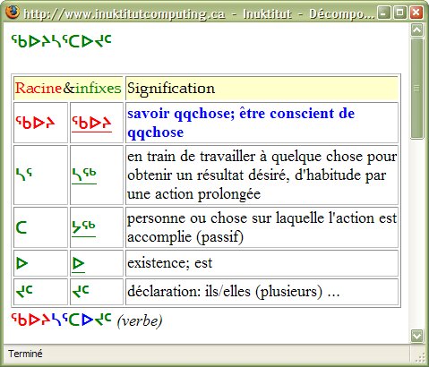 Pour que vous puissiez avoir une idée de ce que fait cette application, nous avons préparé une page de démonstration avec une sélection de mots inuktitut sur lesquels on peut cliquer directement pour obtenir leur décomposition sans devoir installer le lien sur votre navigateur.