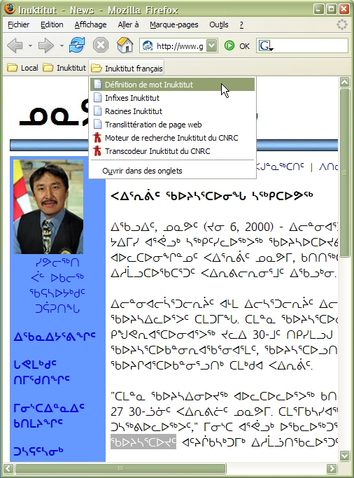Avertissement:Cette application utilise un parseur HTML Java pour déterminer la police de caractères utilisée pour afficher le texte inuktitut syllabique dans une page internet. Malheureusement, ce parseur ne pardonne pas facilement et pour cette raison, lorsque le codage HTML d'une page n'est pas orthodoxe, il pourrait ne pas être capable de déterminer quelle police de caractères a été utilisée, ce qui résulterait en l'incapacité de décomposer le mot sélectionné. |